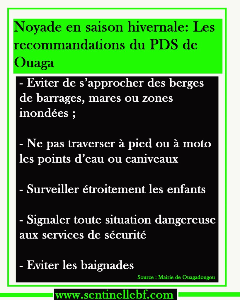 Dans sa note, Maurice Konaté rappelle que la période pluvieuse accroît les risques de noyades, surtout pour les enfants. « Avec les pluies et l’abondance des eaux dans les barrages, mares, caniveaux, les risques d’accidents sont réels notamment pour les enfants et les personnes non averties » a écrit le premier Magistrat de la capitale burkinabè. Face à cette situation, le Président de la délégation spéciale de Ouagadougou a invité les populations à observer cinq (5) mesures.